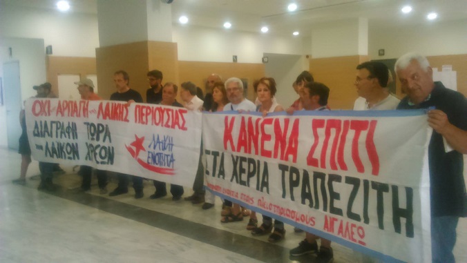 Με συνθήματα «Κανένα σπίτι στα χέρια τραπεζίτη», «Αυτοί μιλάνε για κέρδη και ζημιές, εμείς μιλάμε γι’ ανθρώπινες ζωές», «Η περιουσία η λαϊκή δεν είναι για τα δόντια σου κοράκι Κοντονή», «Κοράκια, κοράκια ηλεκτρονικά, αυτός ο νόμος θα μείνει στα χαρτιά», «Με μέτωπο λαέ σήκω και πολέμα, ΕΕ και ΔΝΤ σου πίνουνε το αίμα», δήλωσαν αποφασισμένοι να συνεχίσουν τον αγώνα τους από τον Σεπτέμβρη και με τη δυναμική τους παρουσία να ανατρέψουν τα σχέδια κυβέρνησης και τραπεζιτών για την αρπαγή της λαϊκής περιουσίας.